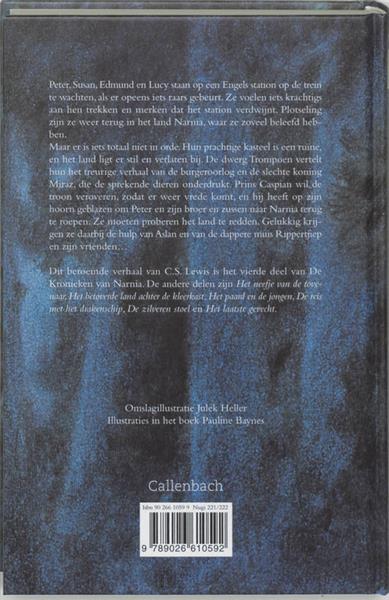 Titel: Prins Caspian / De Kronieken van Narnia / 4 Auteur: C.S. Lewis ISBN: 9789026610592 Conditie: Used De vier kinderen uit Het betoverde land achter de kleerkast komen weer in Narnia terecht, dat er nu stil en verlaten bij ligt. Ze proberen prins Caspian te helpen de troon te veroveren, zodat er weer vrede kan komen.